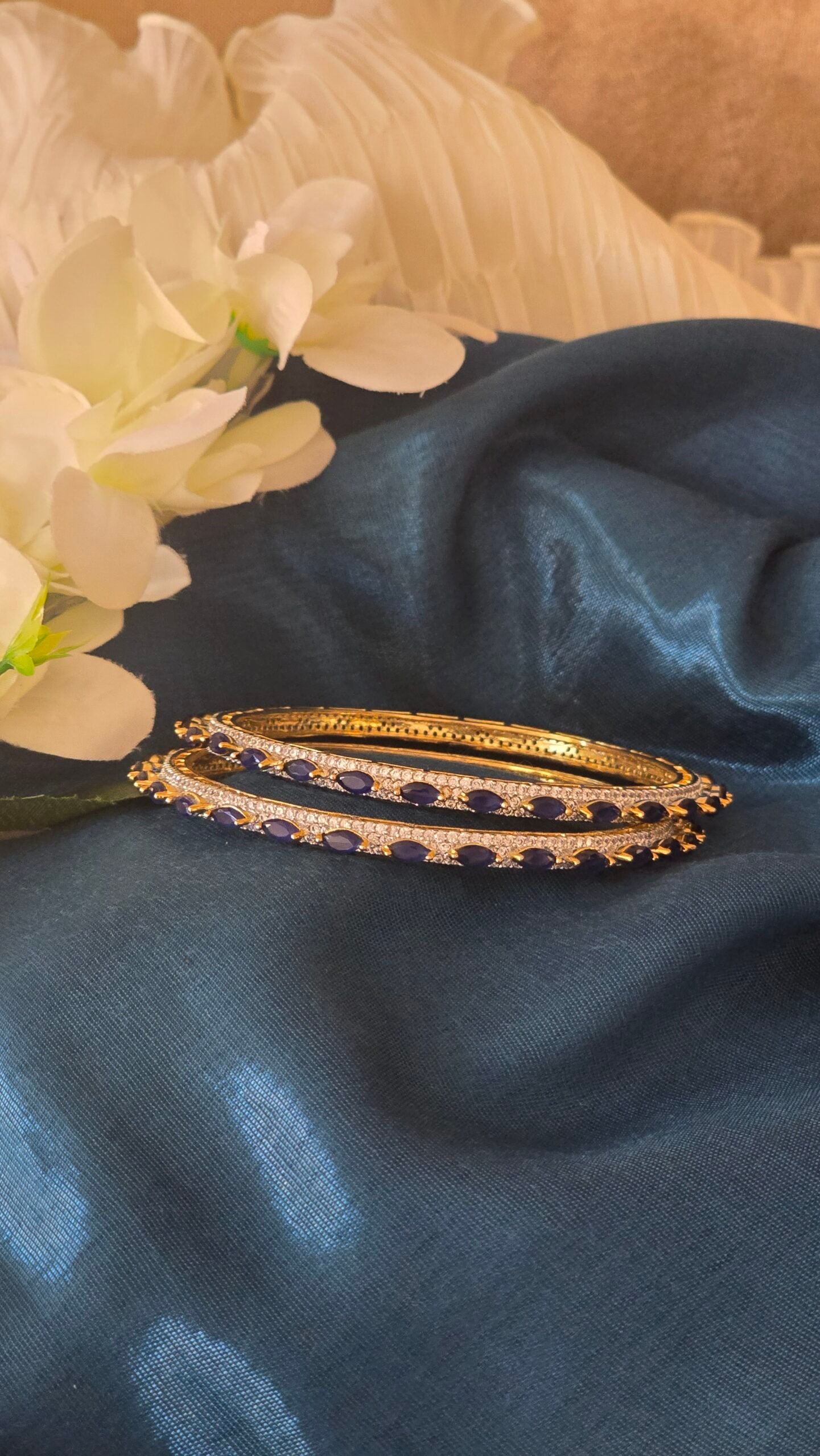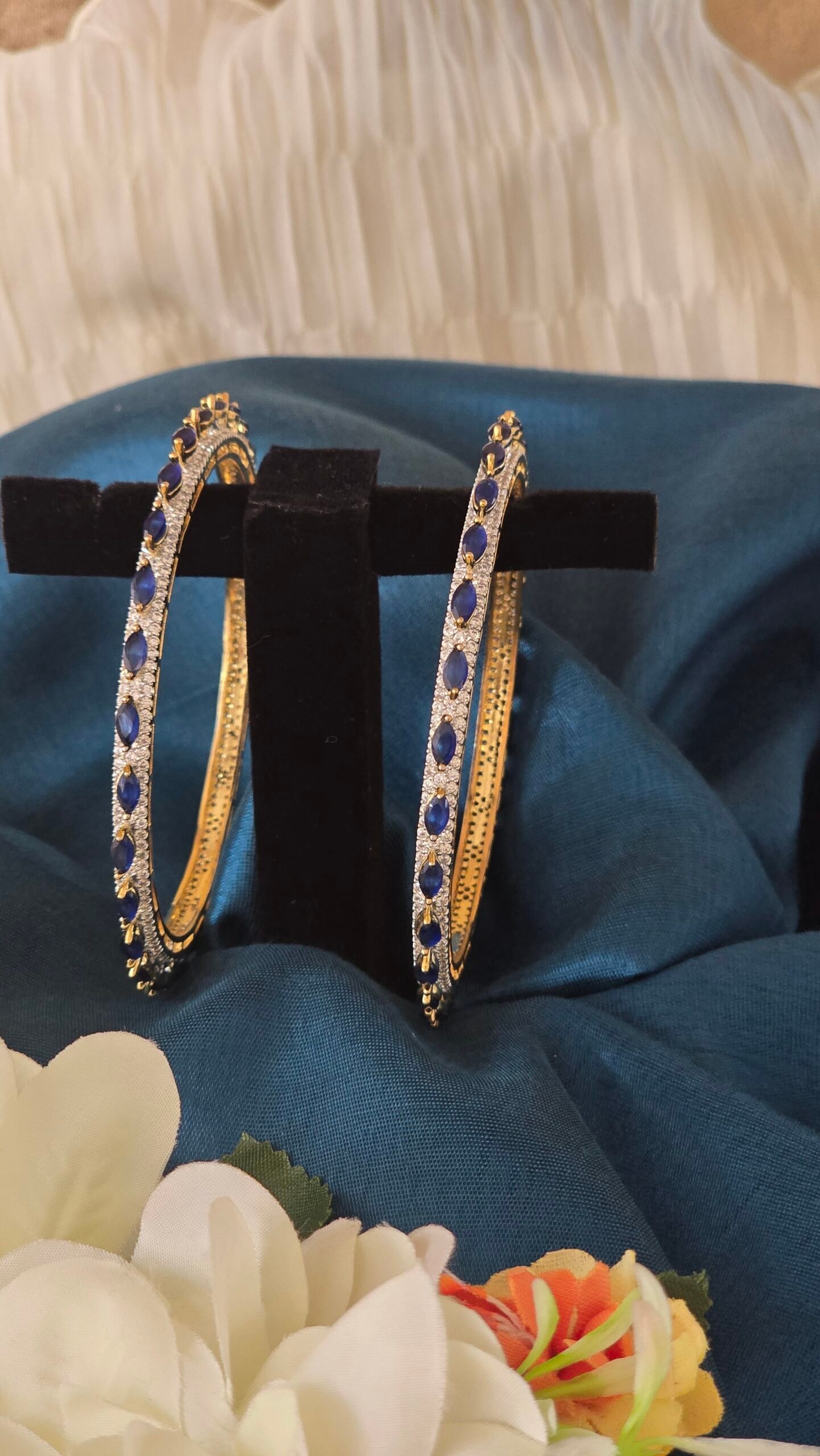 Add a touch of regal brilliance to your ensemble with the Blue Shine Grace Bangles, where classic charm meets vibrant sophistication. Finished in a rich golden polish, these bangles are adorned with shimmering blue stones that evoke the elegance of royal jewels and the serenity of twilight skies.